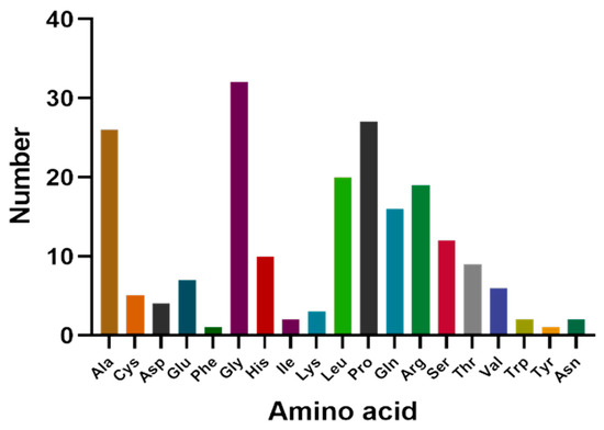 The cDNA of Bactrian camel adipose tissue was used as a template for PCR amplification, and a specific target fragment of 648 bp was obtained (Figure 1). Sequence analysis revealed an open reading frame (ORF) encoding a translation product of 204 amino acids. Because online software can be used to statistically analyze the secondary structure of proteins, no chemical analysis was carried out. The molecular formula of the protein encoded by the HSL gene was analyzed by ProtParam software and predicted to be C897H1442N304O267S5, with a relative molecular mass of 20.91749 kDa and a theoretical isoelectric point of 10.93, with 11 negatively charged amino acid residues (Asp + Glu) and 22 positively charged amino acid residues (Arg + Lys). The half-life of Bactrian camel HSL protein was 7.2 h, with a lipid factor of 59.31, an average hydrophilicity of −0.654, no transmembrane regions in the sequence and an instability index of 59.31. There were 34 potential phosphorylation sites, including 12 serine phosphorylation sites, 9 threonine phosphorylation sites and 1 tyrosine phosphorylation site. Therefore, we suggest that the HSL protein of Bactrian camels is a hydrophobically unstable, non-transmembrane protein. According to analysis of amino acid composition, Gly was the main amino acid (16.49%),followed by Pro (12.16%), Ala (9.46%), Leu (8.38%), Arg (7.57%), Gln (7.30%), Phe (0.49%) and Tyr (0.49%) (Figure 2). Secondary structure predictions revealed that the HSL protein consists of α-helices (51, 25%), β-turns (13, 6.37%), random coils (124, 60.78%) and extended chains (16, 7.8%) (Figure 3A–D). The tertiary structures of the HSL protein further spatially extended based on random coils, alpha helixes and beta turns (Figure 3B).