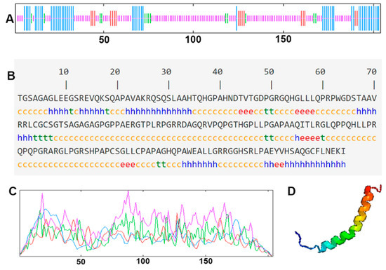 The secondary structure and tertiary structure of Bactrian camel HSL protein. (A,C) Secondary structure; different structures are represented by different color lines: blue, α helix; red, extended strand; green, β turn; purple, random coil. (B) Nucleotides and translated amino acid sequences of the CDS region of HSL. (D) Predictive tertiary molecular structure.