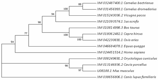 In order to further understand the evolutionary relationships of the HSL gene, the phylogenetic trees of HSL in different species were constructed (Figure 4), with actrian camels clustered primarily with dromedaries and posteriorly with musculus. The results show that Bactrian camel HSL is most closely related to Camelus dromedarius and Camelus pacos, followed by Sus scorfa and cattle, showing the lowest similarity with musculus. The bootstrap value values of each branch shown Figure 4 were greater than 50%, and the vast majority were greater than 70%, indicating that the feasibility of each species branch was high.
