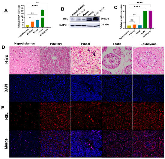 Expression and localization analysis of HSL in Bactrian camel HPG-axis tissues. (A) The expression level of HSL mRNA detected in Bactrian camel HPG-axis tissues by quantitative real-time PCR, with GAPDH as an internal control. Values represent mean ± SD, n = 3. * p < 0.05, ** p < 0.01, **** p < 0.001. (B) Western blot analysis of HSL protein and GAPDH for samples from HPG-axis tissues. (C) The expression density of detected HSL protein; data are expressed as the mean ± SD, **** p < 0.001. (D) Morphology was identified by H&E staining. (E) Analysis of intracellular HSL protein localization in Bactrian camel HPG-axis tissues by immunofluorescence.