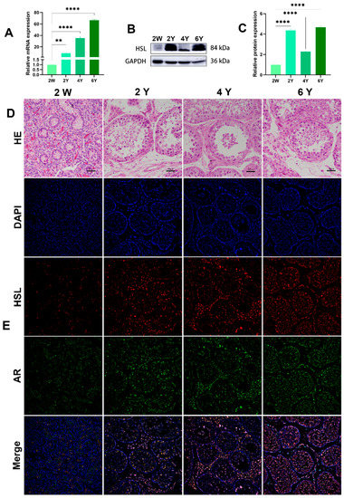 The HSL mRNA level was detected by quantitative real-time PCR (qRT-PCR) in Bactrian camel testicular tissues at different ages. Protein levels in the testis at different ages were analyzed by Western blotting. GAPDH, as a housekeeping gene control, showed clear mRNA-positive signals in all samples. The qRT-PCR results show that HSL mRNA was most highly expressed in 6Y testis, followed by 4Y and 2Y, with the lowest level of mRNA expression level in 2W testis (Figure 6A). Western blot results suggest that HSL protein expression was abundant in testis tissues at different ages, with the lowest level of HSL protein expression in the 2W and significantly increased expression in the 2Y group, 4Y group and 6Y group (Figure 6B,C). Immunofluorescence staining showed that 2W testis had undifferentiated seminiferous tubules with an indistinct shape, and the basement membrane of the varicose ducts was initially formed with a few ovoid Sertoli cells mixed with germ cells. In the 2Y, 4Y and 6Y testis, the testicular seminiferous tubules were further developed, and the germ cells were stratified, including spermatogonia, primary spermatocytes, secondary spermatocytes and spermatozoa in increased numbers were. The positive signals of androgen receptor AR (Sertoli cell and Leydig cell marker protein) and HSL protein at were detected at different developmental stages (Figure 6D,E). A small amount of HSL protein expression was detected in the germinal tubules and mesenchyme of the 2W testis, and the signals of HSL on germ cells, Sertoli cells and Leydig cells were enhanced with increased maturity.