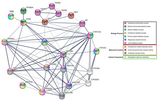 The results of gene ontology (GO) functional enrichment analyses show that HSL is directly or indirectly involved in various biological processes associated with reproductive hormone and lipid metabolism, particularly in steroid hormone metabolism. HSL may directly regulate steroid hormone synthesis acute regulator protein (STAR). In addition, HSL indirectly regulates the androgen receptor (AR) via important rate-limiting enzymes or cytokines that regulate synthesis and metabolism, including steroid 5 alpha–reductase 1 (SRD5A1); cytochrome P450, family 11, subfamily A and polypeptide 1 (CYP11A1); 17-β hydroxysteroid dehydrogenase 3 (HSD17β3); steroidogenic acute regulatory protein-related lipid transfers 4 (STARD4); steroid 5 alpha-reductase 2 (SRD5A2); and hydroxy-delta-5-steroid dehydrogenase–3 beta (HSD3B1). Additionally, HSL may participate indirectly in insulin–like growth factor–1/2 (IGF–1/2) and β-transforming growth factors (TGFBs) (Figure 7). Therefore, we hypothesized that HSL may directly or indirectly regulate steroid hormone synthesis and metabolism.