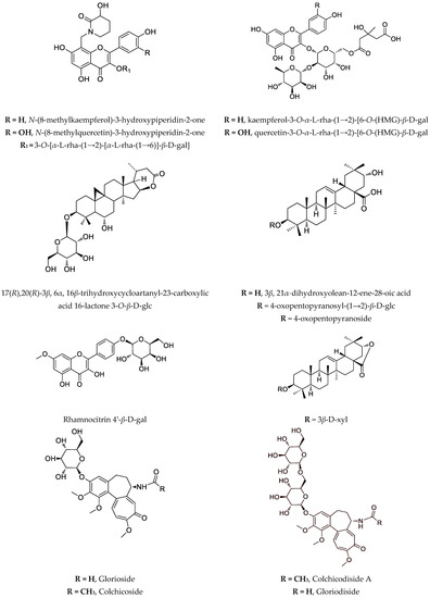 - Zarev, Y.; Foubert, K.; Ionkova, I.; Apers, S.; Pieters, L. Isolation and Structure Elucidation of Glucosylated Colchicinoids from the Seeds of Gloriosa Superba by LC-DAD-SPE-NMR. J. Nat. Prod. 2017, 80, 1187–1191. [Google Scholar] [CrossRef] [PubMed]