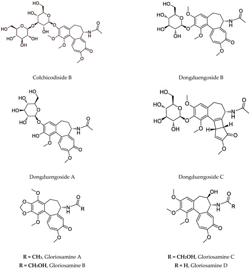 - Kitajima, M.; Tanaka, A.; Kogure, N.; Takayama, H. Four New Colchicinoids, Gloriosamines A–D, from Gloriosa Rothschildiana. Tetrahedron Lett. 2008, 49, 257–260. [Google Scholar] [CrossRef]