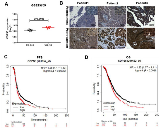In order to understand the potential therapeutic value of COPS5 in platinum-resistant ovarian cancer, we used Gene Expression Omnibus (GEO) datasets to find if there is any relationship between COPS5 and platinum resistance in EOC. GSE15709 is a form of expression and methylation data from A2780 cisplatin-sensitive and A2780 cisplatin-resistant cell lines [10], with both of them having five repeated rounds. We found that COPS5 was overexpressed in A2780 cisplatin-resistance cells (Figure 1A). Next, we performed IHC staining on tissue microarray of 20 patients. Results show that the COPS5 staining in the representative three patients is significantly strong after platinum treatment (Figure 1B). Kaplan–Meier survival curves revealed that COPS5 overexpression was correlated with shorter PFS and OS (Figure 1C,D). The IHC results of twenty pairs of EOC tissues are shown in Figure S1 (see Supplementary Materials). The expression of COPS5 derived from the metastasis tumors on the right were generally higher than the left counterparts. The statistical analysis of the EOC tissue samples according to the intensity of COPS5 staining is exhibited in Figure S2 (p = 0.0034). Subsequently, Kaplan–Meier plots were used to assess the prognostic value of COPS5 in EOC. We noticed that of all the patients treated with platinum from TCGA and GEO datasets, those with higher COPS5 expression tend to have shorter PFS. Furthermore, the OS of patients with platinum-treatment and low COPS5 expression seem to prolong than those with COPS5 overexpression (Figure 1D). These results indicated that COPS5 is correlated with the platinum resistance of EOC and involved in its prognosis.