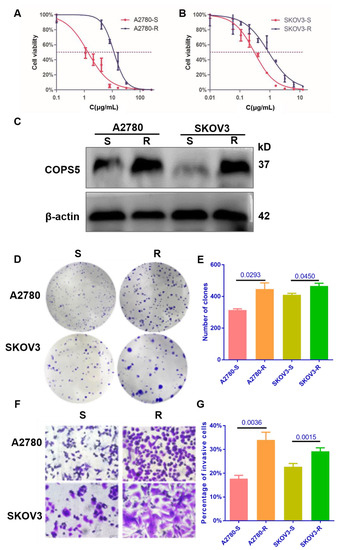 Cell lines resistant to cisplatin have been useful for elucidating the factors that contribute to resistance to platinum. To further verify the expression of COPS5 in platinum-resistant ovarian cancer, we constructed platinum-resistant ovarian cancer cell lines. CCK-8 analysis indicated that the IC50 concentration of the platinum-resistant A2780 cell line was 11.59 ± 0.3584 μg/mL, while the platinum-sensitive A2780 cell line was 1.348 ± 0.247 μg/mL, and the IC50 concentration of the platinum-resistant SKOV3 cell line was 1.326 ± 0.1057 μg/mL, while the platinum-sensitive SKOV3 cell line was 0.3044 ± 0.082 μg/mL (Figure 2A,B). We also found that platinum-resistant related protein CTR1 was downregulated in platinum-resistant A2780 and SKOV3 cells, while GSTP1, GSTT1 and Topo1 were overexpressed (Figure S3), which indicated that the platinum-resistant cell lines were successfully conducted and the expression level of COPS5 in our own constructed cell lines were up-regulated too (Figure 2C). The colonies of platinum-resistant ovarian cancer cells were much larger and greater in number than the platinum-sensitive ones after two weeks of cultivation (Figure 2D,E). Moreover, Transwell analysis showed that platinum-resistant ovarian cancer cells migrated faster than the parental ones. (Figure 2F,G). These results denote that DDP cells demonstrate more aggressive phenotypes, consistent with the clinic phenomenon that ovarian cancer patients with platinum resistance often display tumor regeneration and distant metastasis easier than those who are platinum-sensitive, and with poor prognosis.