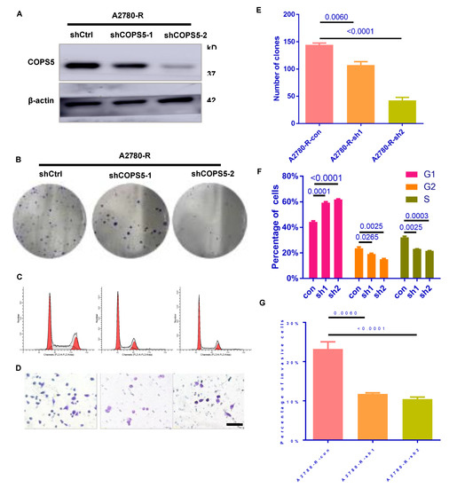 To test the effects of COPS5 on EOC, the lentivirus-mediated RNA interference technique was employed. Western blot analysis confirmed the transfection efficiency (Figure 3A). The colony-forming ability of COPS5 knockdown cell lines was suppressed (Figure 3B,E) and the cell cycle progress was blocked in G1 phase (Figure 3C,F). Transwell analysis revealed that COPS5 silencing inhibited the motility of platinum-resistant A2780 cells (Figure 3D,G).