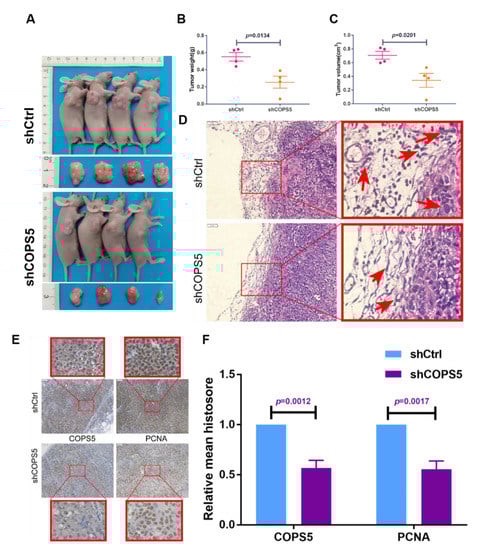 The xenografted mouse model was established to decipher the effect of COPS5 signaling on platinum resistance of ovarian cancer in vivo. Results demonstrated that shCOPS5 significantly diminished the tumor growth in mice (Figure 4A–C). HE staining also demonstrated that the ability of shCOPS5 tumor cells to invade the surrounding tissues was significantly abrogated, 200× (Figure 4D). IHC staining showed that the proliferation ability of shCOPS5 tumor cells was also inhibited, consistent with the experimental results in vitro, 200× (Figure 4E,F).