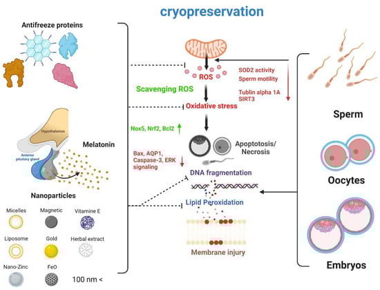Main consequences of using cryoprotectants during cryopreservation. During cryopreservation, gametes and embryos are subjected to oxidative stress and physiochemical damage such as membrane injuries and DNA fragmentation due to rapid environmental changes. During cryopreservation, the number of reactive oxygen species (ROS) dramatically increases due to repressed SIRT3 and superoxide dismutase 2 (SOD2) activity. In particular, sperm motility is considerably reduced due to cytoskeletal alterations, caused by reduced levels of tubulin alpha 1A. Cryoprotectants can successfully reduce the number of ROS via scavenging, which is induced by antioxidant-relevant proteins such as Nox5, Nrf2, and Bcl2. In addition, cryoprotectants can reduce the expression of cell death-related proteins such as Bax, AQP1, and Caspase-3. Altogether, these various effects increase the efficiency of gamete and embryo cryopreservation by inhibiting lipid peroxidation and DNA fragmentation as well as limiting the production of ROS. Figure 1 summarizes the various effects of cryoprotectants. The figure is created with BioRender.com (accessed on 20 May 2022).