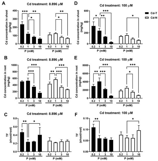 Under 8.896 μM long-term Cd treatment, there was no significant difference between Cd-T and Cd-N with 1 mM phosphorus treatment in Cd concentrations in the shoots and roots (Figure 1A,B). Under long-term low-Cd treatment, 3 mM and 10 mM phosphorus decreased Cd concentrations in the shoots and roots of rice; 0.2 mM phosphorus increased Cd concentrations in the shoots of Cd-T, but had no effect on Cd concentrations in the roots of Cd-T and in the shoots and roots of Cd-N (Figure 1D,E).