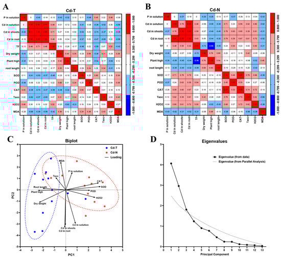 Correlation analysis and principal component analysis between Cd-T and Cd-N indicators. (A) Correlation analysis of Cd-T; (B) Correlation analysis of Cd-N; (C) Biplot figure of principal component analysis; (D) Eigenvalues.