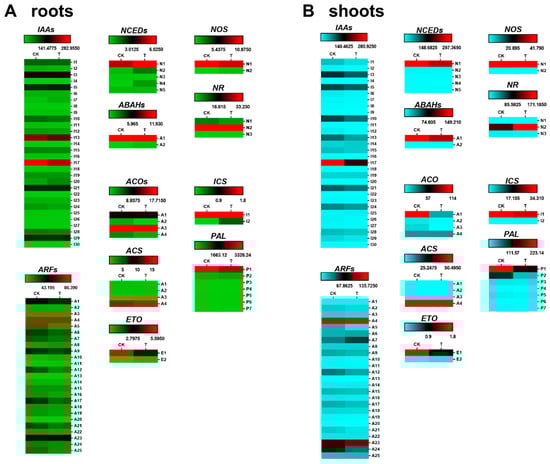 Different expression genes of signal factors (IAA, ABA, ethylene, nitric oxide, and melatonin) in root (A) and shoot (B). (CK is the control group with 1 mM phosphate and 8.896 μM cadmium, T is treatment group with 3 mM phosphate and 8.896 μM cadmium; n = 3).