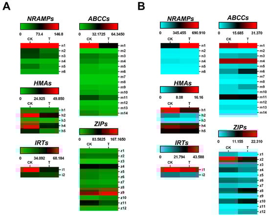 Heat map of main cadmium transporter genes in different treatments of Cd-N roots and shoots. (A) NRAMP, HMA, ABCC, and ZIP gene family expression in Cd-N roots. (B) NRAMP, HMA, ABCC, and ZIP gene family expression in Cd-N shoots. (CK is the control group with 1 mM phosphate and 8.896 μM cadmium, T is treatment group with 3 mM phosphate and 8.896 μM cadmium; n = 3).