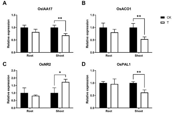 Relative expression of the signaling molecule-related genes OsIAA17 (A), OsACO1 (B), OsNR2 (C), and OsPAL1 (D) in Cd-N. (Values are means with SD, n = 4, p value style is APA, p > 0.05, *: p < 0.05, **: p < 0.01).
