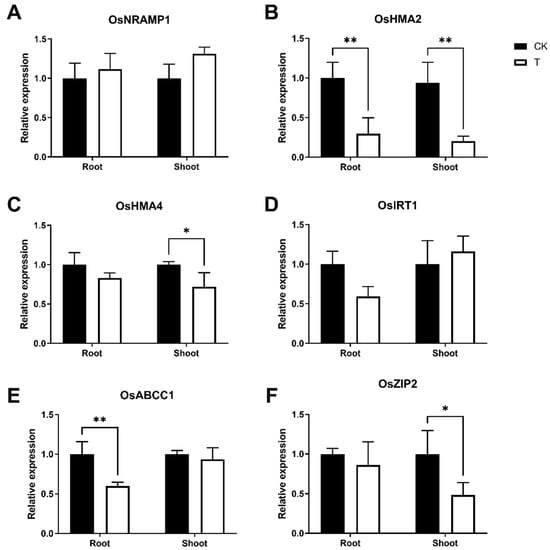 Following 3 mM phosphorus treatment, OsNRAMP1, OsHMA2, 4, 5, OsIRT1, 2, OsABCC1, 11, OsZIP4, 9, 11 were the most highly expressed genes in the roots; OsNRAMP1, OsHMA2, 4, 5, OsIRT1, OsABCC1, 4, 6, 11, OsZIP2, 4 6, 8, 10 were the most highly expressed genes in the shoots. In roots, OsHMA2, 4, 5, OsIRT1, OsABCC1, OsZIP11 were repressed, while OsZIP9 was promoted; in shoots, OsHMA1, OsIRT1, OsZIP2, 4 were repressed, while OsNRAMP1, OsABCC1, 6, OsZIP8, 10 were promoted. OsIRT1 was repressed in both roots and shoots, and no genes were promoted concurrently. We used q-PCR to confirm that the key cadmium transporter genes OsNRAMP1, OsHMA2, OsHMA4, OsIRT1, OsABCC1, and OsZIP2 are regulated in their expression (Figure 6).