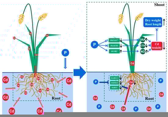 In this study, we investigated the effect of phosphorus on rice’s response to cadmium toxicity by submitting two distinct rice genotypes to a variety of phosphorus and cadmium treatments. The results indicated that increasing the phosphorus treatment can regulate the expression of signaling factors and suppress the expression of cadmium transporters in rice. We believe that higher phosphorus treatments are effective at reducing Cd accumulation in rice. Possible mechanisms for phosphorus to reduce cadmium toxicity in rice are shown in Figure 8.
