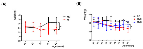 Changes in the weights of mice at different ages in each group. (A) Changes in the weight of mice in the MC and M groups; (B) Changes in the weight of mice in the RC, the M + R, and M + C groups. (n = 8, Comparison within M group: ▲ p < 0.05; comparison between MC and M groups: * p < 0.05; comparison between M + R and M + C groups: # p < 0.05).