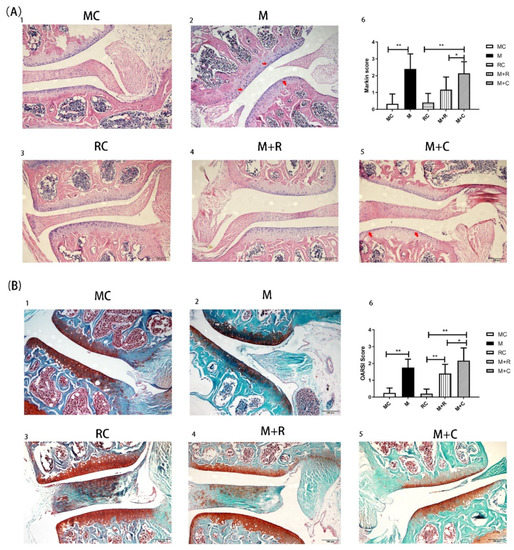Histological evaluation of joint tissue sections by HE and safranin O staining. (A) HE stained histological images of the knee joints; A(1): HE staining for MC group; A(2): HE staining for M group; A(3): HE staining for RC group; A(4): HE staining for M + R group; A(5): HE staining for M + C group; A(6): The Mankin score of each group; (B) Safranin-O-Fast Green stained histological images of the knee joints of mice; B(1): Safranin-O-Fast Green staining for MC group; B(2): Safranin-O-Fast Green staining for M group; B(3): Safranin-O-Fast Green staining for RC group; B(4): Safranin-O-Fast Green staining for M + R group; B(5): Safranin-O-Fast Green staining for M + C group; B(6): The Mankin score of each group. The red arrow indicates the site of cartilage damage. (n = 8, * p < 0.05, ** p < 0.01.).