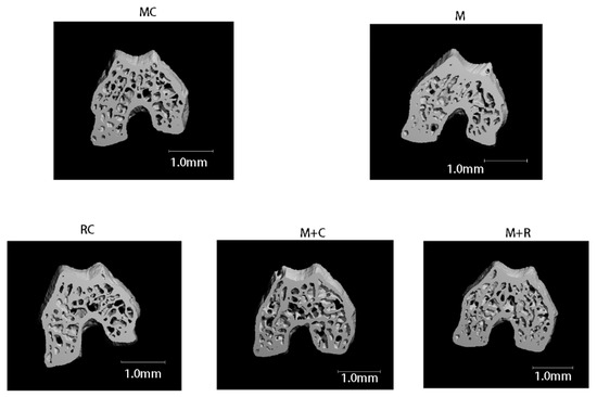 Images of the 100 upper layers of the femoral condyle were captured to reconstruct the subchondral bone of the knee joint to obtain bone morphological indicators. The three-dimensional reconstruction of the subchondral bone microstructure is shown in Figure 3. The bone trabeculae in the MC and M + R groups were regular in shape and neatly arranged. Compared with the MC group, the trabecular bone cortex of the M group was thickened with significantly increased bone mass. Moreover, in contrast to the M + R group, the number of trabecular bones in the M + C group was significantly less, and the arrangement was uneven.
