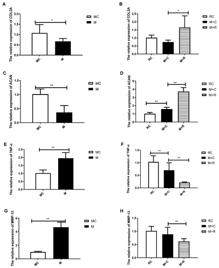 The gene expression of metabolic and inflammatory factors of knee joint cartilage. (A,B) the expression of COL2A mRNA; (C,D) the expression of ACAN mRNA; (E,F) the expression of TNF-α mRNA; (G,H) the expression of MMP-13 mRNA (n = 8, * p < 0.05, ** p < 0.01.)