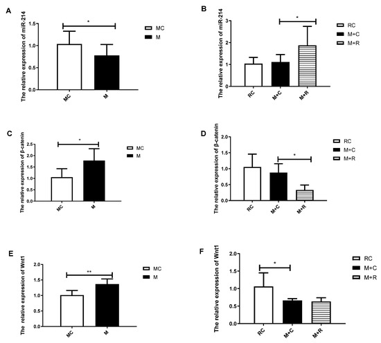 The expression of mouse cartilage miR-214 and its related downstream genes. (A,B) the expression of miR-214; (C,D) the expression of Wnt1 mRNA; (E, F) the expression of β-catenin mRNA. (n = 8, * p < 0.05, ** p < 0.01.)