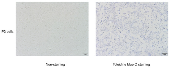 Primary cells were passaged to the third generation for later intervention. P3 cells were evaluated with toluidine blue O staining to ascertain that they were chondrocytes. As shown in Figure 6, the acid-aggregated proteoglycan of chondrocytes can be stained by combining with the cations in toluidine blue O, which can stain the nuclei blue. The cells were polygonal, paving-stone shaped, which is the typical morphology of chondrocytes; thus, the cells were confirmed as chondrocytes.