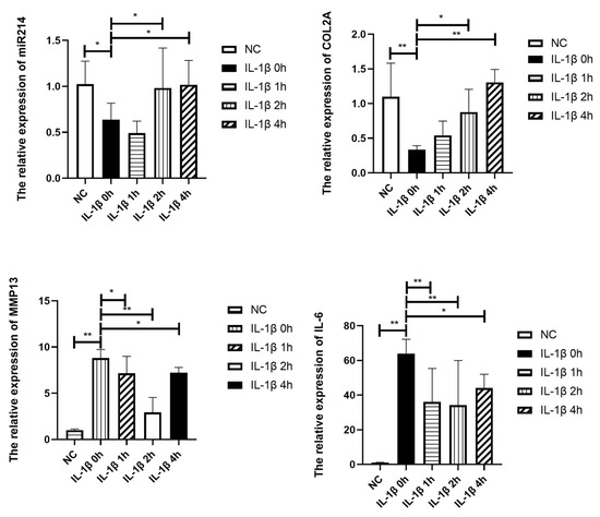 RNA expression of metabolic, inflammatory factors and miR-214 of chondrocyte. NC: Control group, IL-1β 0 h: IL-1β+ 0 h strain, IL-1β 1 h: IL-1β+ 1 h strain, IL-1β 1 h: IL-1β+ 1 h strain, IL-1β 2 h: IL-1β+ 2 h strain, IL-1β 4 h: IL-1β+ 4 h strain (n = 4, * p < 0.05, ** p < 0.01.)