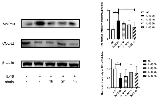 Protein expression of metabolic factors of chondrocytes. NC: Control group, IL-1β 0 h: IL-1β+ 0 h strain, IL-1β 1 h: IL-1β+ 1 h strain, IL-1β 1 h: IL-1β+ 1 h strain, IL-1β 2 h: IL-1β+ 2 h strain, IL-1β 4 h: IL-1β+ 4 h strain (n = 4, * p < 0.05).
