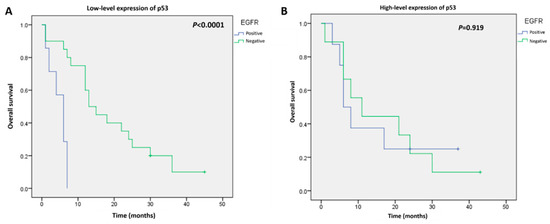 Kaplan–Meier analysis of overall survival in patients with EGFR-positive or EGFR-negative astrocytomas and (A) low-level expression of p53 or (B) high-level expression of p53.