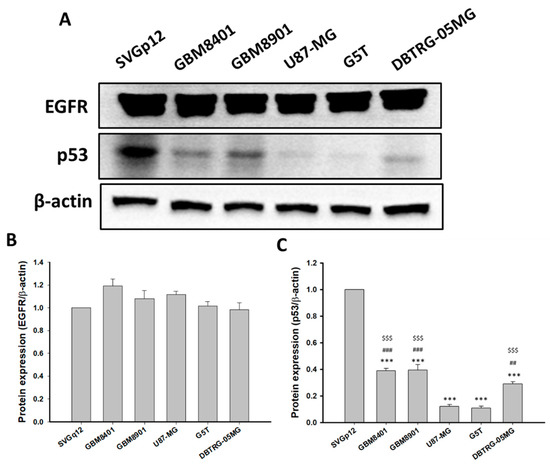 Differences in p53 and EGFR protein expression in normal and cancer cells were determined by Western blotting in glial cells (SVGp12) and GBM cells (GBM8041, GBM8901, U87-MG, G5T, and DBTRG-05MG). No significant differences in EGFR protein expression were detected in GBM8401, GBM8901, U87-MG, G5T, DBTRG-05MG, or SVGp12 cells (Figure 5). However, p53 protein levels were significantly lower in GBM8401, GBM8901, U87-MG, G5T, and DBTRG-05MG cells compared to the expression in SVGp12 cells (Figure 5). In addition, p53 protein expression levels in GBM8401, GBM8901, and DBTRG-05MG were significantly higher than expression levels in U87-MG and G5T cells (Figure 5). Therefore, GBM8401, GBM8901, and DBTRG-05MG cells had high p53 expression levels, and U87-MG and G5T cells had low levels of p53 expression.
