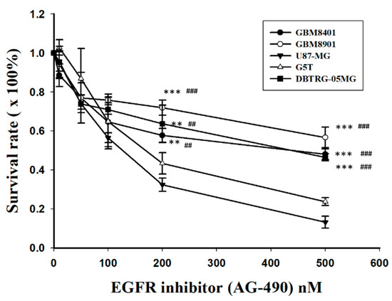 All the cells were incubated at 37 °C with 5% CO2. GBM8401, GB8901, and DBTRG-05MG cells were cultured in RPMI medium plus 10% fetal bovine serum (FBS). The U87-MG and SVGp12 cells were cultured in modified Eagle’s medium (MEM) plus 10% FBS. G5T cells were cultured in Dulbecco’s MEM medium plus 10% FBS. GBM8401, GBM8901, U87-MG, G5T, and DBTRG-05MG were GBM cell lines, and SVGp12 was a glial cell. The cells were treated with AG490 (S1143, Selleckchem, Houston, TX, USA) at 0, 100, 200, 300, 400, and 500 nM concentrations.