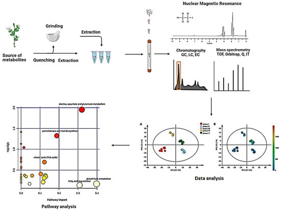 Sample preparation is the most basic and crucial stage for all plant molecular biological studies since sample integrity dictates the entire outcome of the experiment, i.e., the acquired data and the subsequent biological interpretation. It is critical to keep experimental and biological variance to a minimum to ensure the metabolomic analyses are consistent, robust, and valid [,,]. However, a metabolomic approach generally requires minimal sample preparation relative to the other genomic approaches such as genomics, transcriptomics, proteomics, which are labor intensive [,]. However, a diverse set of metabolites with varying physio-chemical complexity and relative abundance poses numerous challenges in plant metabolism []. The most common extraction method includes liquid–liquid extraction (LLE), solid-phase extraction (SPE), supercritical fluid extraction (SFE), and microwave aided extraction (MAE) [,,,,,,,].