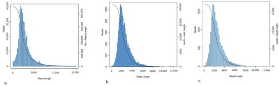 The length distribution map. (a) CCS length distribution. (b) Polished consensus isoforms length distribution. (c) The length distribution after redundancy removal.