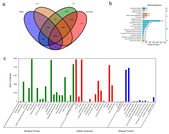 Gene annotation and functional classification. (a) Annotation information in 4 databases of the Venn diagram. (b) Annotation in KEGG pathway classification. The five KEGG metabolic pathways: A. Organismal Systems; B. Metabolism; C. Genetic Information Processing; D. Environmental Information Processing; E. Cellular Processes. (c) GO classification of all isoforms. The three main categories: biological process (BP), cellular component (CC), and molecular function (MF).