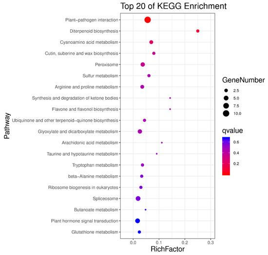 The input data of gene differential expression analysis was the data of gene expression level obtained from the RNA-seq, which was analyzed using DESeq2, including the standardized probability of hypothesis testing. Such a probability was calculated according to the model to obtain the FDR value. Based on the results of the variance analysis, we screened FDR-value < 0.05 and |log2FC| > 1 (fold change) genes for DEGs. Comparing the M group with high D-borneol content, there were 26 up-regulated genes and 224 down-regulated genes in the Y group with low D-borneol content (the detailed FPKM values of differentially expressed genes were provided in Supplementary Table S1.M1-vs-Y1.filter.annotation). Differential gene expression patterns were hierarchically clustered, and a heat map (Figure 4) was used to present the clustering results. These genes with similar expression patterns may have common functions or may participate in common metabolic pathways and signaling pathways. The expression patterns of genes from the three Mei Pian Trees were similar, whereas those from the three Yin Xiangs were similar, but those of Mei Pian Trees and Yin Xiangs differed from each other (Figure 4). All of these DEGs were annotated by GO and KEGG analyses. According to the GO annotation analysis, the highest DEGs were involved in cellular, metabolic, and single-organism biological processes (Figure 5). In the cell components, the highest levels of DEGs were related to the components of the cell and cell parts. In the molecular function, the DEGs were concentrated on the binding and catalytic activities. According to the KEGG annotation (Figure 6), DEG in ko04626 had the most annotations. Such a DEG belongs to the interaction pathway between the plant and the pathogen in the biological system. It had annotated 10 DEGs, all of which had a downtrend. This annotation suggested that D-borneol biosynthesis might be related with the interaction of the plant and the pathogen.