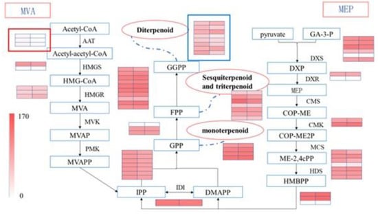 According to previous studies on the biosynthesis and metabolism of terpenoids in plants [7,8,9], 5-carbon skeleton isopentenyl pyrophosphate (IPP) and dimethylallyl diphosphate (DMAPP) are prerequisites for the synthesis of terpenoids. Mevalonate (MVA) and 2-C-methyl-D-erythritol-4-phosphate (MEP) are the two major pathways for the biosynthesis of IPP and DMAPP in plants. In the MVA pathway, the biosynthesis of IPP in cytoplasm begins with two acetyl-CoA, through acetyl-CoA C-acetyltransferase (AAT), hydroxymethylglutaryl-CoA synthase (HMGS), hydroxymethylglutaryl-CoA reductase (HMGR), mevalonate kinase (MK), phosphomevalonate kinase (PMK), diphosphomevalonate decarboxylase (MVAPP), and other enzymes. In the MEP pathway, the biosynthesis of IPP in plastids begins with pyruvate and glyceraldehyde-3-phosphate, through 1-deoxy-D-xylulose-5-phosphate synthase (DXS), 1-deoxy-D-xylulose-5-phosphate reductoisomerase (DXR), 2-C-methyl-D-erythritol 4-phosphate cytidylyltransferase (CMS), 4-diphosphocytidyl-2-C-methyl-D-erythritol kinase (CMK), 2-C-methyl-D-erythritol-2,4-cyclodiphosphate synthase (MCS), (E)-4-hydroxy-3-methylbut-2-enyl-diphosphate synthase (HDS), 4-hydroxy-3-methylbut-2-en-1-yl diphosphate reductase (HMBPP) and other enzymes. Then, IPP is converted into DMAPP under the catalysis of isopentenyl-diphosphate delta-isomerase (IDI) and divalent metal ions. IPP and DMAPP are catalyzed by prenyltransferase into geranyl diphosphate (GPP), the precursor of monoterpenoid biosynthesis. GPP is catalyzed by farnesyl diphosphate synthase (FPS) into farnesyl diphosphate (FPP), the precursor of sesquiterpenoid and triterpenoid biosynthesis. FPP is catalyzed by geranylgeranyl diphosphate synthase (GGPPS) into geranylgeranyl diphosphate (GGPP), the precursor of diterpenoid biosynthesis. Therefore, studying these genes of key enzymes and their expression characteristics is the focus of this research in exploring the mechanism of terpenoid biosynthesis.
