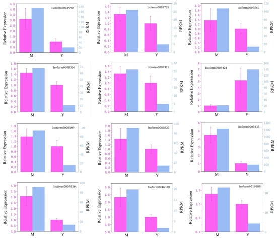 Standard curves were drawn using the reverse-transcribed cDNA at a 6-fold dilution at an annealing temperature of 56 °C, which were shown in the Supplementary Materials. According to the standard curves, the amplification efficiencies of the reference gene and all selected DEGs were between 90% and 110%. The determination coefficient (R2) was more significant than 0.980, and all chosen primers could be used in subsequent validation experiments. The location of the primers, the amplicon length, the predicted function and other information about the sequences were in the Supplementary Materials (highlighted in Table S1 and in Table S2). Amplification specificity was shown by a single peak in the melt peak curve. The melt peak curves and the amplification curves for all amplified genes were provided in the Supplementary Materials (File folder S2 and File folder S3). Although only four isoform (isoform0008424, isoform0009335, isoform0009336, isoform0016328) expressions were significantly different (Sig < 0.05) in Mei Pian Tree and Yin Xiang, the trend in the expression levels (Figure 8), showed that the RPKM value obtained by RNA-seq was basically consistent with that obtained by qRT-PCR, indicating the reliability of RNA-seq.