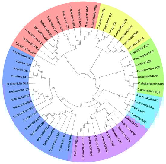 Similarity sequences from other plants involved in the phylogenetic analysis were listed in Table 5. The result of the phylogenetic analysis was shown in Figure 9. Four monoterpenoid synthase genes (Isoform0001596, Isoform0007083, Isoform0007712, and Isoform0007910) were clustered with short-chain dehydrogenase genes from C. micranthum. It was speculated that the function of these four genes may be related to dehydrogenation. Seven sesquiterpenoid synthase genes were clustered into three classes. This suggested that the functions of these seven sesquiterpenoid synthases were split into three categories. Among them, three (isoform0003899, isoform0003384, and isoform0003359) were clustered with sesquiterpenoid synthase genes from C. micranthum. One isoform (isoform00004679) was clustered with the squalene sesquiterpenoid synthase gene of C. micranthum. The other three (isoform0007425, isoform0003562, and isoform0002418) were associated with the squalene monooxygenase of C. micranthum. Eight diterpenoid synthase genes were also clustered into three categories. The isoform0014050, isoform0002236, isoform0013597, and isoform0010625 were classified with the ent-kaur-16-ene synthase of C. micranthum. Isorform0016988, isoform0016583, and isoform0001793 had clustered with diterpene geranyllinalool synthase, indicating that these two categories of diterpenoid synthase might have different functions from each other. The last diterpenoid synthase (isoform00004821) was clustered with beta-amyrin11-oxidase, indicating that this diterpenoid synthase differed from both above. Although the group of the last isoforms (isoform0003899, isoform0003384, and isoform0003359) was related to sesquiterpenoid synthase, it clustered with the diterpenoid synthase group.