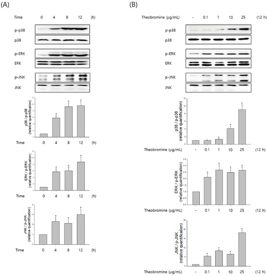For each experiment, experiments were performed in triplicate, and the results are reported as means ± SEM. Comparisons of means between theobromine-treated cells and untreated control cells were made using Student’s t-test and ANOVA using the SigmaPlot 10.0 software. Significant values are indicated by an asterisk (* p < 0.05).