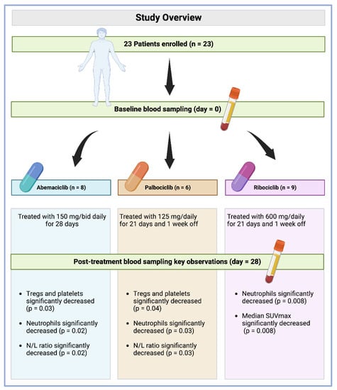 Patients were assigned to orally receive either abemaciclib (n = 8, 34.8%), palbociclib (n = 6, 26.1%), or ribociclib (n = 9, 39.1%) at a dose of 150 mg/bid daily, 125 mg/daily, and 600 mg daily, respectively (28 days of continuous treatment for abemaciclib, 21 days of treatment and one week off for palbociclib and ribociclib) before starting with the standard combination with letrozole 2.5 mg/daily [,]. Blood sampling was performed at baseline and after 28 days of treatment. Treatment was stopped in cases of unacceptable toxicity or imaging confirmation of disease progression. Toxicities were classified according to the CTCAE version 4.03. All patients enrolled in the study experienced at least one adverse event (AE), and all except 1 patient in the 600 mg dose group experienced at least one grade 3 AE. The most frequent AEs were hematologic, followed by nausea and increased laboratory values. The most frequent AEs of any grade were hematologic, a finding consistent with other studies of CDK4/6 i. The most frequent treatment-related ≥3 grade AEs were leukopenia (82%), neutropenia (72%), and lymphopenia (69%). However, these AEs were generally mild and none of them individually occurred in more than two patients enrolled in the trial. All events resolved without clinical action. None of the patients discontinued treatment due to an AE.