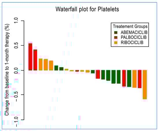 With regards to thrombocytopenia, although we observed decreased platelet counts among the entire cohort of patients, this was most apparent in patients treated with abemaciclib. Thrombocytopenia is another emerging side effect of CDK4/6 i treatment reported in PALOMA−2, PALOMA−3, MONALEESA, and MONARCH−3 trials. More specifically, any-grade thrombocytopenia was observed in 15–25% of patients in PALOMA−2 and PALOMA−3 trials, with grade 3 and grade 4 thrombocytopenia observed in 1 to 2% and 0.2 to 1% of patients, respectively [,]. The incidence of any-grade thrombocytopenia was 9.3 to 11% in MONALEESA trials, with grade 3 and grade 4 thrombocytopenia observed in 1% of patients [,]. As for abemaciclib, any grade thrombocytopenia occurred in 36.2 to 53.2% of patients in MONARCH−2 and MONARCH−3 trials, with grade 3 and grade 4 thrombocytopenia reported in 1.3 to 2% and 0.6 to 1.4% of patients, respectively [,].