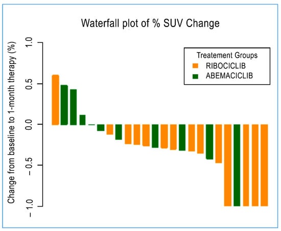 Radiometabolic response at baseline and after 28 days (28 days of continuous treatment for abemaciclib, 21 days of treatment and one week off for palbociclib and ribociclib) was available for only 9 out of 23 patients and a total of 24 malignant lesions. Four of these patients were administered with abemaciclib (10 malignant lesions), and five were issued with ribociclib (14 malignant lesions), as reported in Table 4. Overall, a significant decrease in median SUVmax was reported among all 24 lesions from baseline. The median SUVmax measure decreased from an average value of 4.8 at diagnosis to 2.9 at the end of treatment (p = 0.006). Regarding the specific treatment, only those lesions treated with ribociclib reached statistical significance (p = 0.008), with a decrease in median SUVmax from an average value of 4.75 at diagnosis to 2.9 at the end of treatment. Those lesions treated with abemaciclib, although showing a decreasing trend for SUVmax, did not achieve statistical relevance (Figure 3).