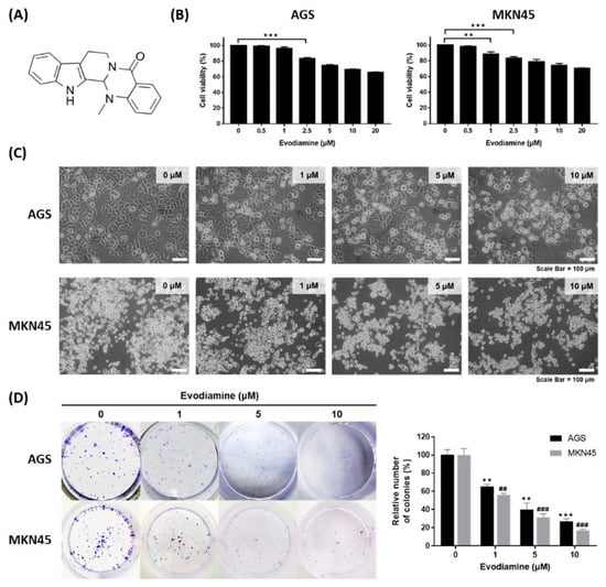 Inhibitory effect of evodiamine on the cell viability of gastric cancer cell lines. (A) Chemical structure of evodiamine. (B) Gastric cancer cells, AGS and MKN45, were treated with the indicated doses of evodiamine (0, 1, 5, and 10 μM) for 24 h and cell viability was measured by WST assay. Data were from three independent experiments and analyzed by unpaired Student’s t-tests (** p < 0.01 and *** p < 0.001). (C) The images were captured using an inverted microscope (×400). (D) Clonogenic growth inhibition by evodiamine was evaluated by clonogenic assay and representative images of cells stained with crystal violet are shown. Colonies containing >50 normal-appearing cells were counted visually, and the percentage inhibition of colony formation is illustrated as a graph. Data were from three independent experiments and analyzed by unpaired Student’s t-tests. ** p < 0.01 and *** p < 0.001 vs. the non-treated control in AGS cells; ## p < 0.01 and ### p < 0.001 vs. the non-treated control in MKN45 cells.