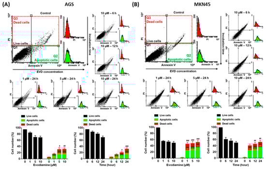 Annexin V and PI staining of AGS and MKN45 cells after evodiamine treatment. (A) AGS and (B) MKN45 cells were treated with 10 μM evodiamine for 6, 12, or 24 h and 1, 5, or 10 μM evodiamine for 24 h, stained with annexin V-FITC and PI, and subjected to flow cytometry. Stained cells were analyzed and illustrated on the quadrant by CellQuestPro software. Percentage of cells in apoptosis was analyzed and illustrated as a graph. Data are presented as the mean ± SEM. * p < 0.05, ** p < 0.01, and *** p < 0.001 vs. the apoptotic cells control; # p < 0.05, ## p < 0.01, and ### p < 0.001 vs. the dead cells control. EVD, evodiamine.