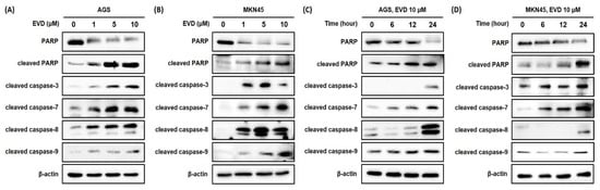 Evodiamine stimulates induction of PARP cleavage and the cleavage of caspase-3 and caspase-7 in AGS and MKN45 cell. Indicated doses of evodiamine (0, 1, 5 and 10 μM) for 24 h were applied to (A) AGS and (B) MKN45 cells. A total of 10 μM evodiamine for the indicated time periods (0, 6, 12, and 24 h) was applied to (C) AGS and (D) MKN45 cells. The cell lysates were subjected to Western blot to evaluate the levels of PARP, cleaved PARP, and cleaved caspase-3, -7, -8, and -9. β-actin was used as an internal control. EVD, evodiamine.