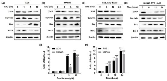 Effect of evodiamine on the expression of the anti- and pro-apoptotic molecules in AGS and MKN45 cells. Indicated doses of evodiamine (0, 1, 5, and 10 μM) for 24 h were applied to (A) AGS and (B) MKN45 cells. A total of 10 μM evodiamine for the indicated time periods (0, 6, 12, 24 h) was applied to (C) AGS and (D) MKN45 cells. The cell lysates were subjected to Western blot to evaluate the levels of XIAP, survivin, Bax, and Bcl-2. β-actin was used as an internal control. (E,F) The intensity of Bax and Bcl-2 was normalized to β-actin and the ratio was calculated. Data are presented as the mean ± SEM of three independent experiments and analyzed by a Student’s t-test. ** p < 0.01 and *** p < 0.001 vs. the non-treated control in AGS cells; # p < 0.05 and ### p < 0.001 vs. the non-treated control in MKN45 cells. EVD, evodiamine.