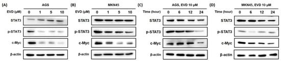 It was confirmed that the phospho-STAT3 protein was decreased in a dose- and time-dependent manner when evodiamine was applied to AGS and MKN45 cells. The expression of cMyc was also diminished by evodiamine treatment (Figure 6). The result suggested that evodiamine suppressed the activation of STAT3, which downregulated the expression of c-Myc. This can lead to a decrease anti-apoptotic proteins, such as Bcl-2, which consequently seemed to result in apoptosis of gastric cancer cells.