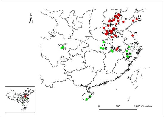Distribution of the E. indica populations which collected seeds from 10 provinces in China. Each population was numbered and the color of the circle according to the results of different analysis in this research.
