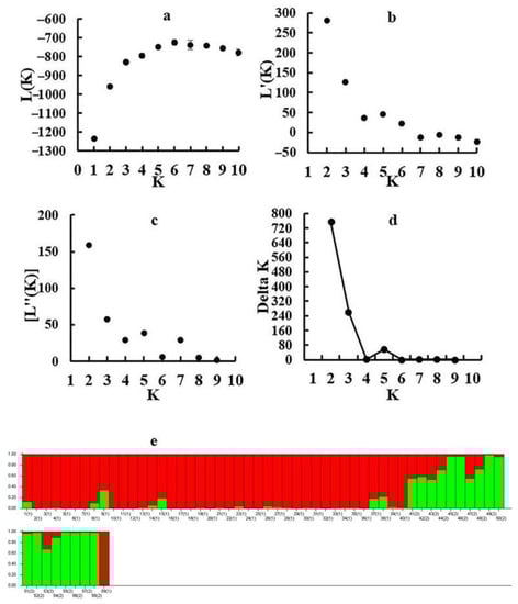 Results of STRUCTURE analysis for 59 populations using 14 EST-SSR markers: (a) Plot mean likelihood L(K) and variance per K value. (b) Plot of mean rate of change of the likelihood distribution L’(K) per K value. (c) Plot of absolute value of the second order rate of the change of the likelihood distribution |L’’(K)| per K value. (d) Estimation of population using Delta K value with cluster K ranging from 1 to 10. (e) Estimation of population structure based on STRUCTURE analysis.