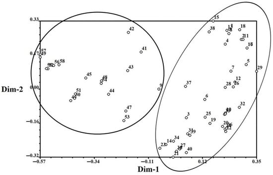 The degree of polymorphism for each primer pair was determined by their polymorphism information content (PIC) values, which were calculated using MicroSatellite tools (MS tools). The POPGENE32 (version 1.31) was selected to calculate the parameters of population genetics for each primer pair, including the number of alleles per locus (Na), observed heterozygosity (Ho), expected heterozygosity (He), and the effective number of alleles (Ne) [,]. NTsys-pc software (version 2.10s) was used to calculate the Dice genetic similarity coefficient values via the unweighted pair-group method, with arithmetic averaging (UPGMA) cluster analysis []. GeneAlEx (version 6.5) was applied to estimate the molecular variance (AMOVA) in populations, in populations within groups, and among groups. Additionally, principal component analysis (PCA) was performed using GeneALEX (version 6.5). The population genetic structures of 59 E. indica populations were analyzed using STRUCTURE software (version 2.3.4), and 20 independent runs were performed for each K value. There were 100,000 burn-in period iterations and 500,000 Markov chain Monte Carlo repetitions per run (K ranged from 1 to 10) [].